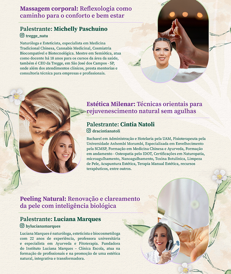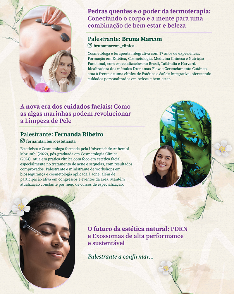 Grandes especialistas estarão reunidos para compartilhar seus insights e técnicas que estão transformando o mundo da cosmetologia natural. Confira os temas que vamos abordar: